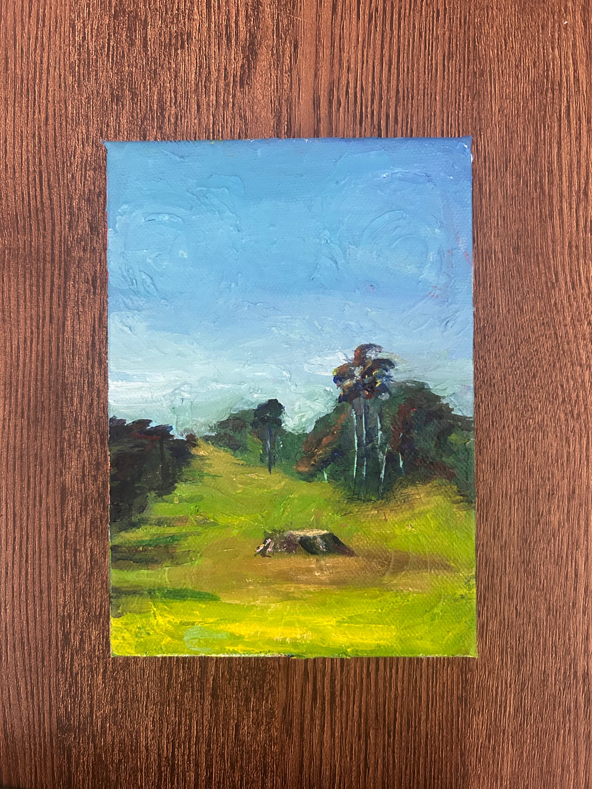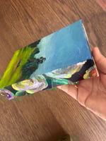 5 x 7 x 1.5 inches. Oil on canvas (over an old painting)
