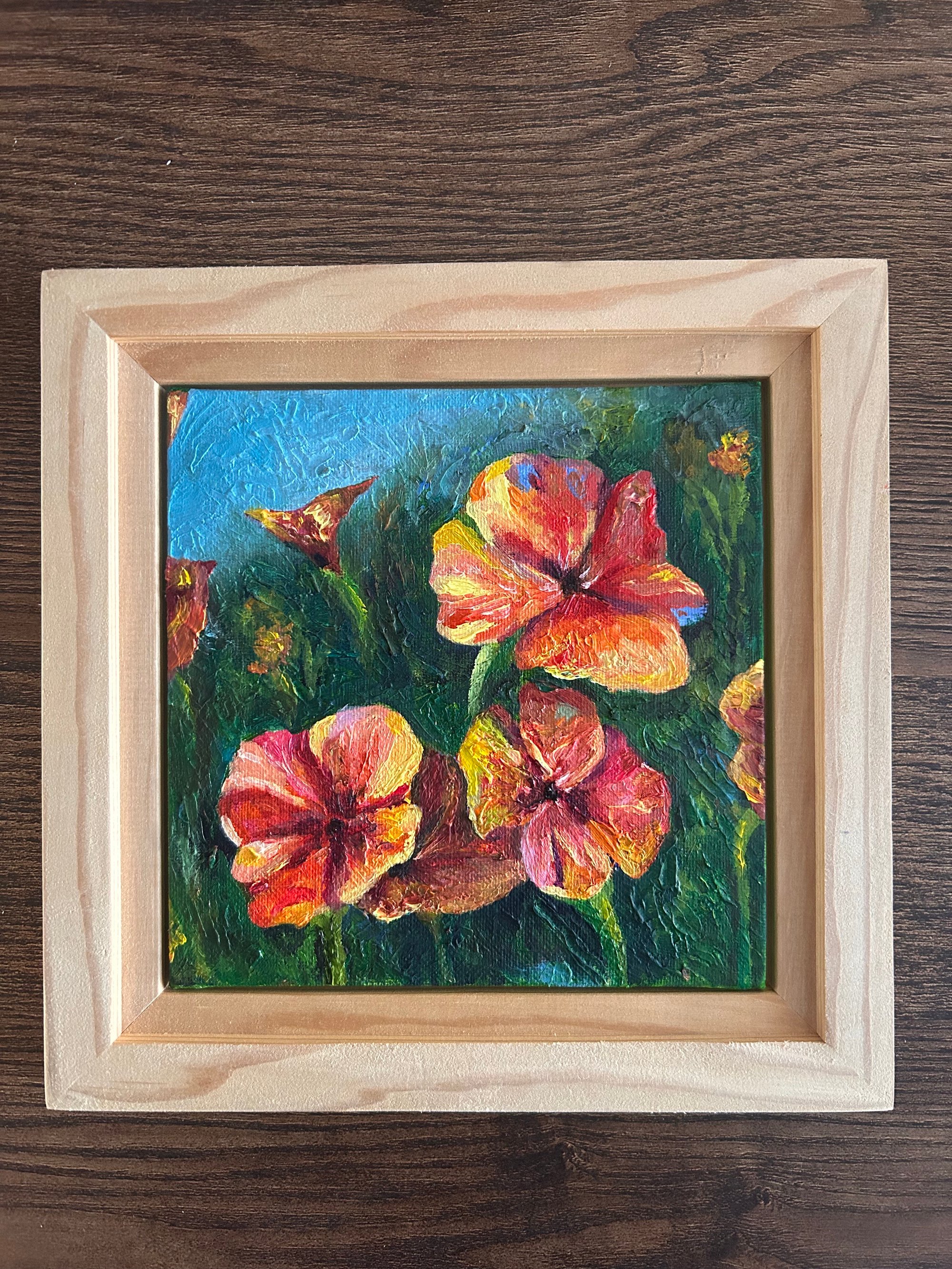 6 x 6 inches (8x8 inches with wooden frame). Oil on canvas panel.